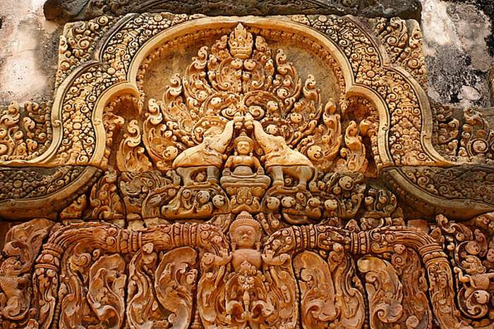 建于十世紀的女皇宮,充分展現(xiàn)了吳哥時期高超的雕刻功力,細膩而傳神的刻畫,代表了吳哥人民的藝術天份,與對宗教的信仰熱忱。紅色的石墻,生動的故事,交織出一幅幅柔美的圖畫,不斷訴說著印度史詩中的各個章節(jié);透過浮雕的傳達,前人藉此留下印記,即使是過了幾個世紀之久,后代的人們都還能從中讀出一二,歷史不朽也就是如此了。