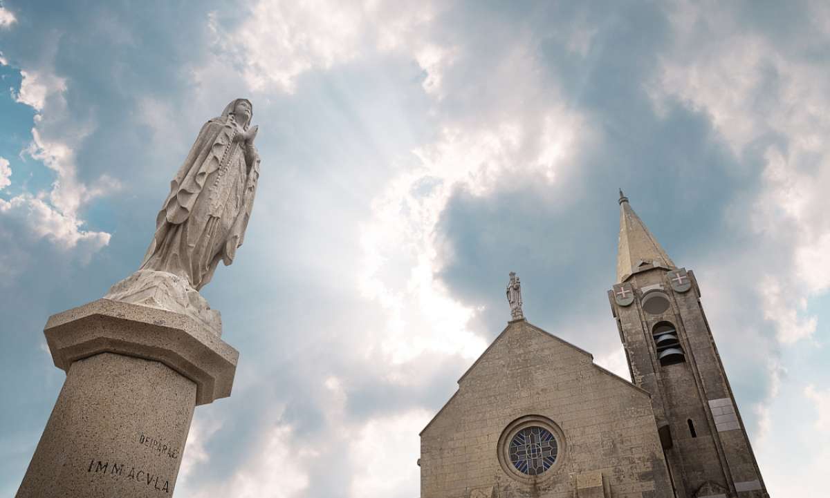 教堂前是一片寬廣平臺,平臺盡處豎立一尊大理石雕刻而成的圣母像,圣母雙手合十,貌甚慈祥,面臨大海。平臺下有一路德圣母巖洞,循左右環抱之石階而下,即達洞前。版權所有山東聊城聊之旅國際旅行社有限公司,轉載必究!洞內巖石嶙峋,中開拱門,內立圣母像,象征古時圣母在法國路德城內,當眾顯靈的情景。其間正置祭壇,洞前有鐵柵圍繞,地上設有多排低矮的長石板,供教徒跪拜,懺悔。