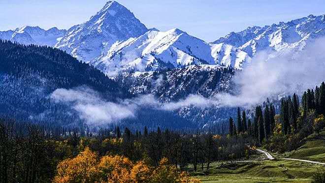 喀班巴依峰海拔4257米,是以哈薩克著名民族英雄之名命名。提克喀拉尕依,哈薩克語,意為挺拔壁立的云杉樹之意,其雪嶺云杉攀坡而生,隨山巒起伏,猶如一道沿山而筑的長城,延綿不斷,風(fēng)吹林海,松濤聲嘯,實(shí)為難得之美景。