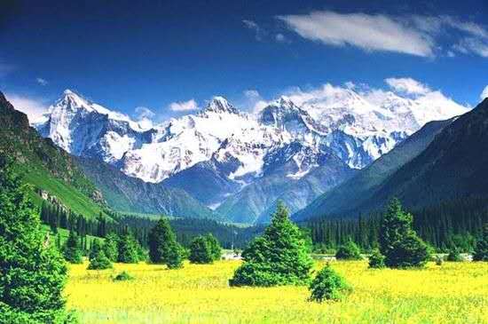 在庫爾德寧闊谷向南方眺望,晴空麗之下,一座白雪皚皚,勢如劍挺,雄居群山之上的高大山峰就是喀班巴依峰??Π喟鸵婪搴?257米,是那拉提山肪最高峰,也是伊犁著名山峰之一。
