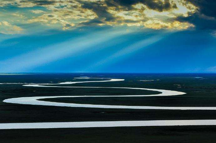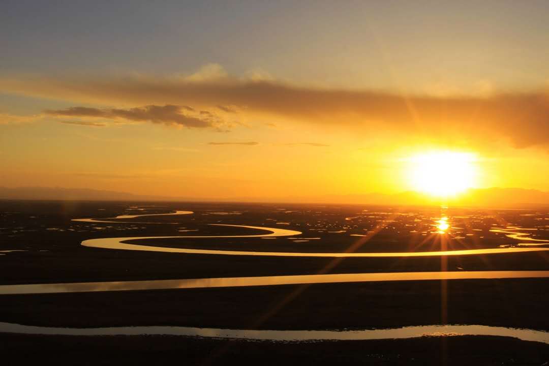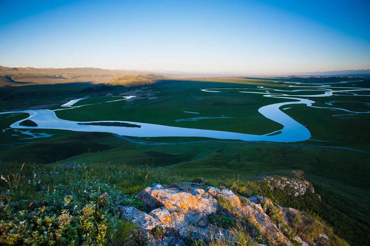 開都河的源頭云霧繚繞,特別是盛夏,云涯水暖,云水難辨,仿佛河水從天而降。開都河上游河流由小尤勒都斯盆地,經過巴音布魯克,到大尤勒都斯盆地,水流平緩,河谷開闊,四周牧草豐茂,是天然的優良牧場。特別是在小尤勒都斯盆地平坦遼闊的草原上,開都河蜿蜒流淌,形成九曲十八彎的壯麗景象。那模樣,像一個大寫的蒙古文字,有一種鬼斧神工的靈氣。
