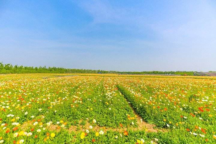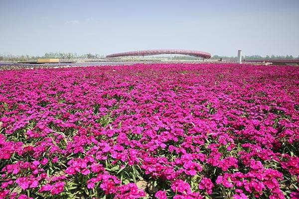 公園內(nèi)的“衲田花海”,總面積2220畝,由612塊花田 “縫補(bǔ)”拼接而成,融合了北方旱梯田的雄渾和南方水梯田的俊秀,與僧人袈裟異曲同工,又兼具納祥聚福之意,樸質(zhì)卻熠熠生輝。這里栽植著50多種花卉,自南向北形成黃、紅、紫三大色區(qū),呈現(xiàn)出海納百川之態(tài)、兼容并蓄之美。站在全長2.3公里的彩虹橋俯瞰花海,聽花開花落,嗅濃郁芬芳,感受濃濃的原鄉(xiāng)情懷。