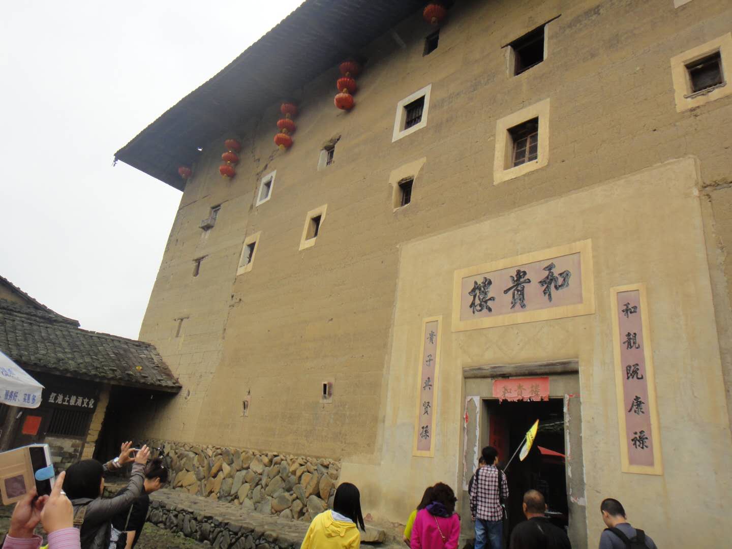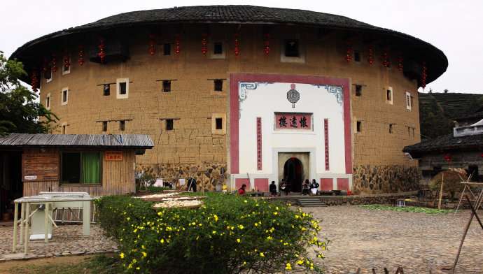 和貴樓每層有28個房間,共有140個房間。樓正中開一個大門,東西南北四方各有樓梯上下。它建于清雍正十年(1732年),據說當初選址建樓,開始并未發(fā)現這是塊沼澤地,樓建了一層,忽然整層樓像沉船一樣,慢慢下沉到了爛地里,建樓的簡姓族人無可奈何,只好在下沉的樓墻上打了100多立方米的排樁,他們覺得地基這下牢固了,就從頭開始夯墻,建起了一座五層高的方樓。他們似乎很有把握,從不擔心大樓會傾斜或者下沉,果然兩百多年來,和貴樓固若金湯,風雨不動安如山。現在,你在樓中學堂的小天井用鐵線往地