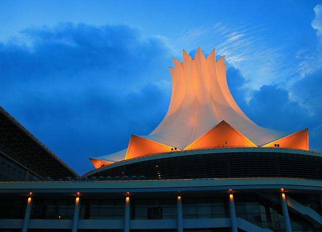 多功能廳的屋頂,就是潔白無瑕的“大穹頂”,它是整個(gè)中心的標(biāo)志,被稱為南寧國際會展中心的“靈魂”。從多功能大廳往上走可以到達(dá)觀景平臺,在這里不但能俯瞰瑯東美景,更能近距離地觀看和觸摸到這朵巨型“朱槿花”。大穹頂直徑約60米,重達(dá)800噸,以朱槿花為造型,其12片白色的“花瓣”象征著廣西12個(gè)少數(shù)民族,獨(dú)特的造型在國內(nèi)尚屬首創(chuàng)。10月23日晚上,會展中心全線亮燈,在1000多盞燈具、燈飾不同角度的照射下,大穹頂如同一塊玲瓏剔透的水晶,散發(fā)出與白天完全不同的魅力,其夜景效果不可不看。