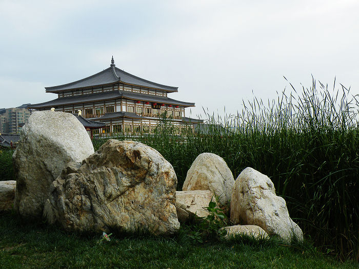 沿著唐城墻遺址走到東南角,就是曲江池遺址公園的西入口。舉目遠眺,能看到湖心仙島,波光中依仙島而設(shè)的荷廊恰似一朵盛開的水蓮花。若是向更遠處,能望到閱江酒樓在曲江池南岸的柳色掩映中,酒旗招展似乎要引得游人快步,而重重柳堤、香花和池水卻致人流連漫步。性急的游客,這時候也可以直接駕車取曲江池西路直接繞到公園南口進酒樓,然而這未免饕餮了一路由北向南的盛景。