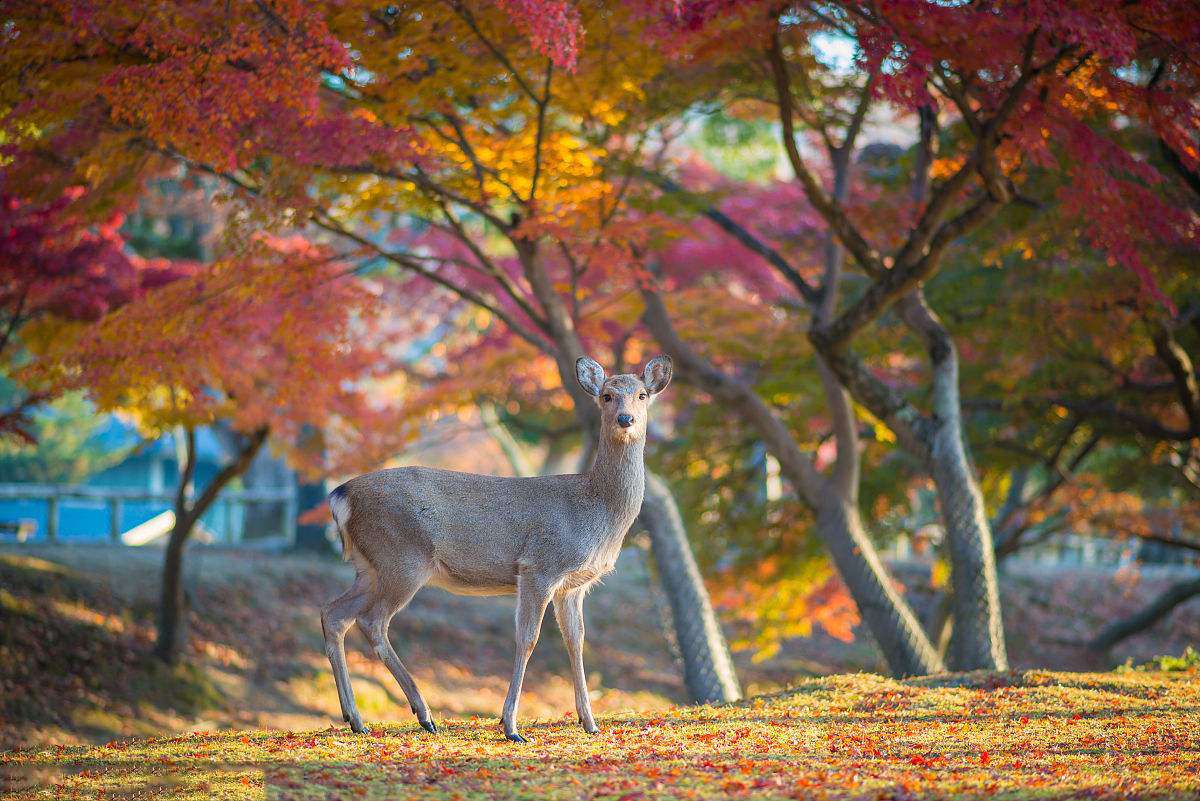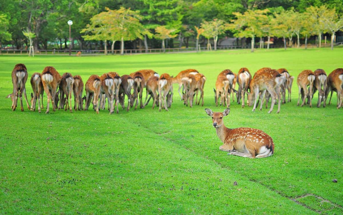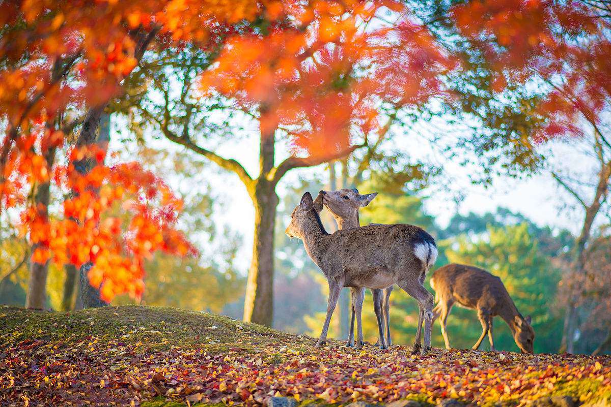 鋸鹿角,日語寫作“鹿の角きり”。為了保護游客的安全,并防止奈良公園中的樹木遭受損壞,每年10月份前半個月的星期日,奈良公園都要舉行一個“鋸鹿角”的傳統活動。“鋸鹿角”的過程是:稱為“勢子”的人將鹿抓住,灌入神酒讓它安定下來,然后由神官將鹿角鋸斷。
