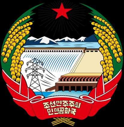 連綿起伏的淡藍色群山環抱著寧靜的湖泊,藍白色的湖水由水閘傾瀉而下,形成壯觀的瀑布,大壩下聳立著高壓輸電塔架。正上方紅色五角星金光四射,迸發出力量的焰火。國徽上的水電站代表以重工業為基礎的現代工業和工人階級,兩側由紅色飾帶束起的金色稻穗則代表農業和農民,山巒和湖泊象征朝鮮的“三千里錦繡江山”。