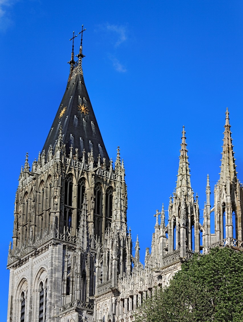 圣女貞德教堂建于1979年,外觀象一個倒扣的維京船,維京人是諾曼底人的祖先,以勇猛頑強著稱。建筑以板巖或銅制鱗片做頂,面向大海。教堂內部有法國目前保存最好的文藝復興時期法國第一批彩繪玻璃窗,講述著早期諾曼底人的生活故事。外面的大十字架就是貞德火刑紀念柱。500多年前,圣女貞德就在魯昂接受審判并被處以火刑,這成為人們到訪魯昂的原由之一。圣女貞德教堂,建于貞德殉葬的原址。這座近代教堂有雙重天職;它既是紀念圣女貞德的教堂,又是紀念這位女英雄的民間紀念館,每年都吸引了無數的國內外游客。
