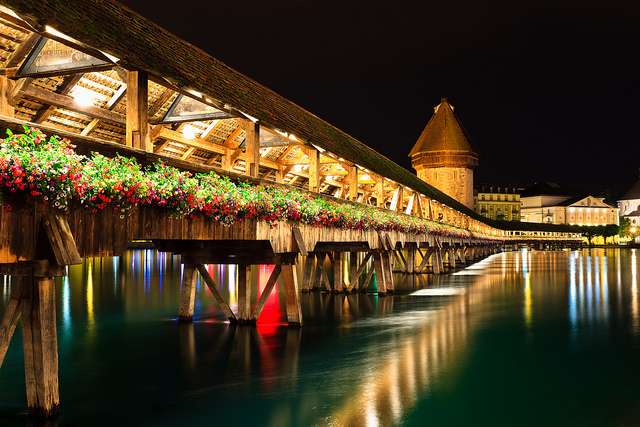 瑞士琉森最負盛名便是卡佩爾廊橋Chapel Bridge(Kapellbrücke)又叫教堂橋,這是盧塞恩的標志,始建于1333年,也是歐洲最古老的有頂木橋,橋的橫眉上繪有120幅宗教歷史油畫,沿途還可欣賞描述當年黑死病流行景象的畫作。