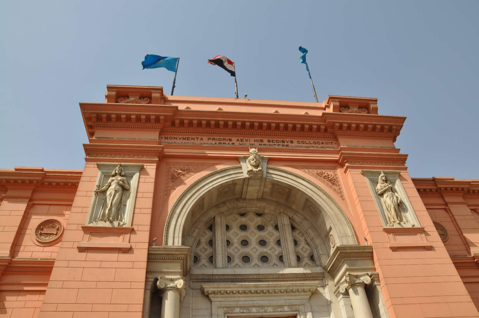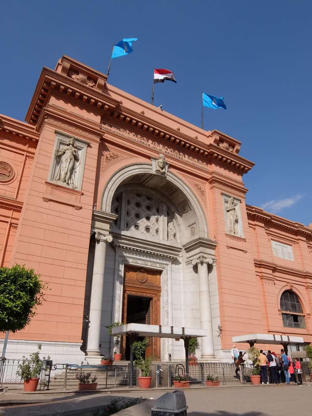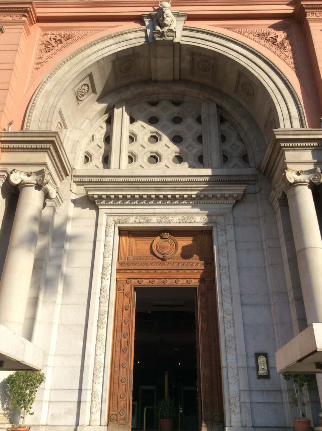 博物館入口的設計融入了古埃及藝術的特征:大門的外廓是一個圓形拱門,拱門兩側的壁龕中各有一個將法老形象歐式化的浮雕,其中一個持有紙莎草,另一個持有蓮花,分別象征古代埃及的南北方。