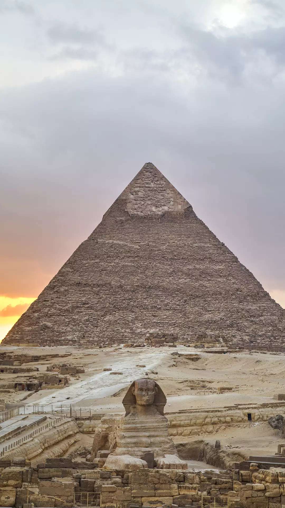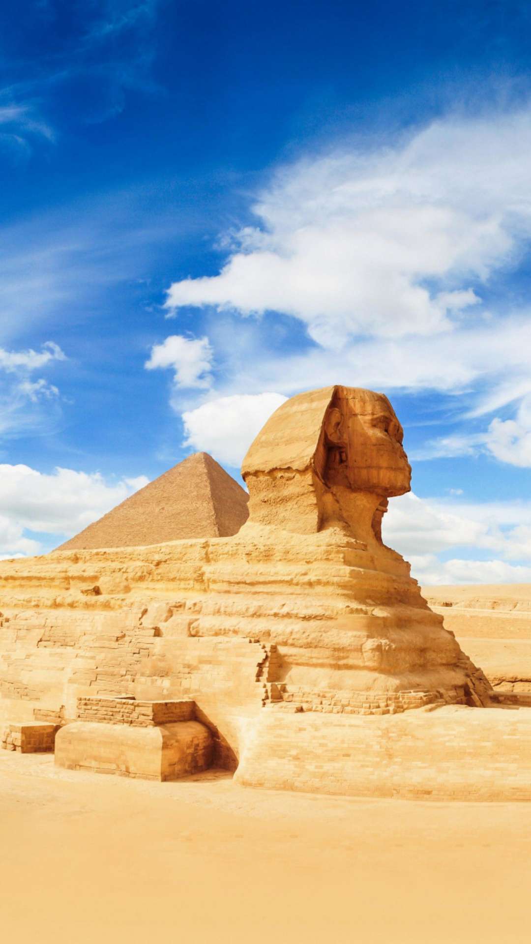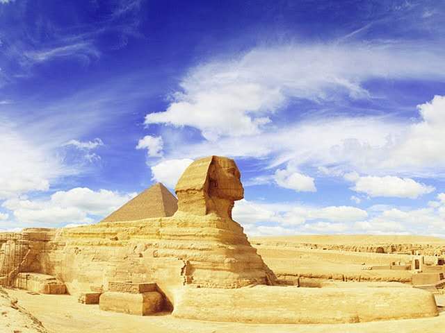 獅身人面像(又譯“斯芬克斯” sphinx)坐落在開羅西南的吉薩大金字塔近旁,是埃及著名古跡,與金字塔同為古埃及文明最有代表性的遺跡。像高21米,長57米,耳朵就有2米長。除了前伸達15米的獅爪是用大石塊鑲砌外,整座像是在一塊含有貝殼之類雜質的巨石上雕成。面部是古埃及第四王朝法老(即國王)哈夫拉的臉型。相傳公元前 2611年,哈夫拉到此巡視自己的陵墓——哈夫拉金字塔工程時,吩咐為自己雕鑿石像。工匠別出心裁地雕鑿了一頭獅身,而以這位法老的面像作為獅子的頭。在古埃及,獅子是力量的象征,獅身人面像實際上是古埃及法老的寫照。雕像坐西向東,蹲伏在哈夫拉的陵墓旁。由于它狀如希臘神話中的人面怪物斯芬克斯,西方人因此以“斯芬克斯”稱呼它。