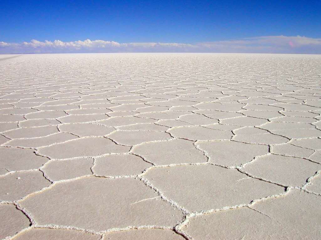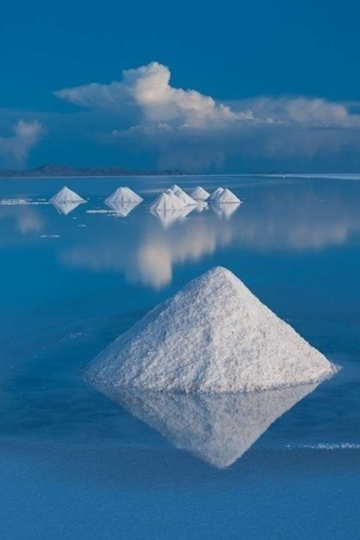 在高原南端有一些冰川融化時留下的鹽湖,而在1萬年前最后一個冰期(第四紀(jì)冰期)結(jié)束時,湖水已逐漸消失。高原上最大并最令人印象深刻的就是烏尤尼鹽沼(Salar de Uyuni)。每年夏季(雨季12月至次年1月),它被雨水注滿,形成一個淺湖;而每年冬季(旱季7月至10月),湖水則干涸,留下一層以鹽為主的礦物質(zhì)硬殼,中部達(dá)6米厚。人們可以駕車駛過湖面。尤其是在雨后,湖面像鏡子一樣,反射著好似不是地球上的、美麗的令人窒息的天空景色,這也就是傳說中的“天空之鏡”。由于面積空曠,極其光滑(覆蓋著淺水),同時又極平整(海拔差異極小),地表反射率極高,使阿塔卡瑪成為一個理想的測試和校準(zhǔn)地球遙感衛(wèi)星之地。