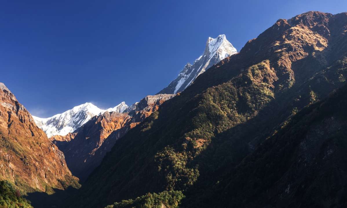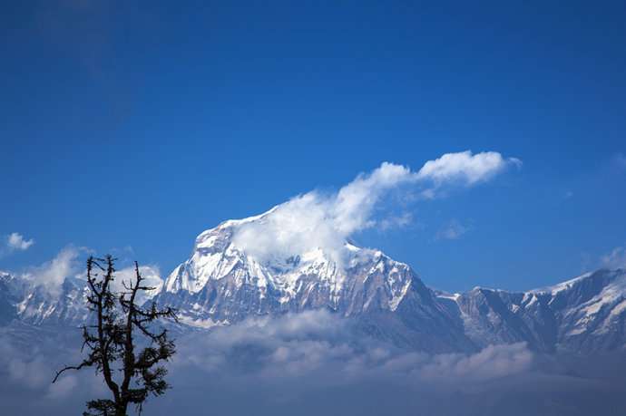 魚尾峰雖然不是尼泊爾最高的山峰,但卻成為尼泊爾的標志。從波卡拉的費娃湖附近,可以看到這座圣山和周圍峰群,突出于較低的山巒之上。