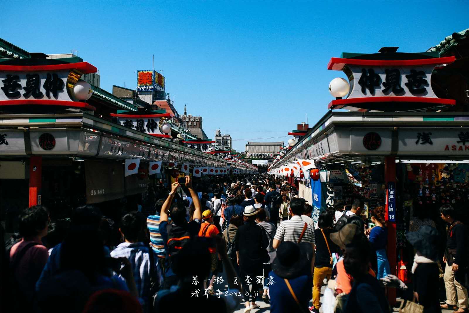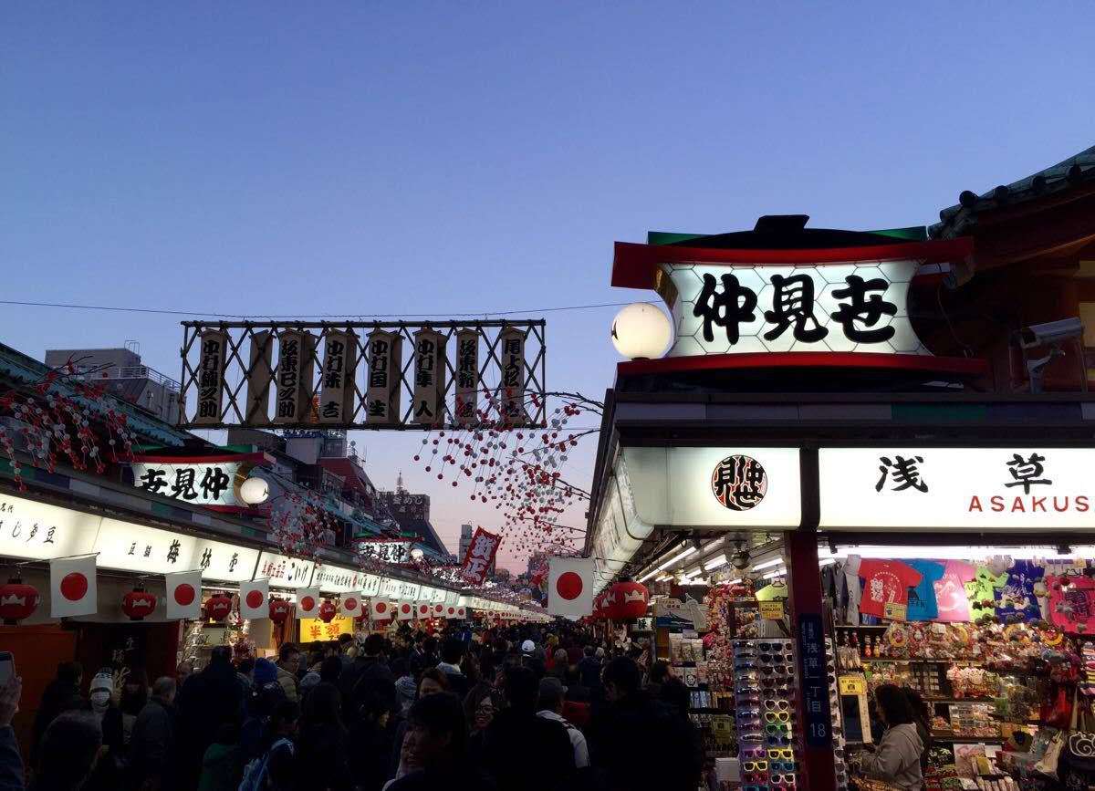 仲見(jiàn)世商業(yè)街從雷門(mén)延伸到淺草寺主要場(chǎng)地,大約250米長(zhǎng)。