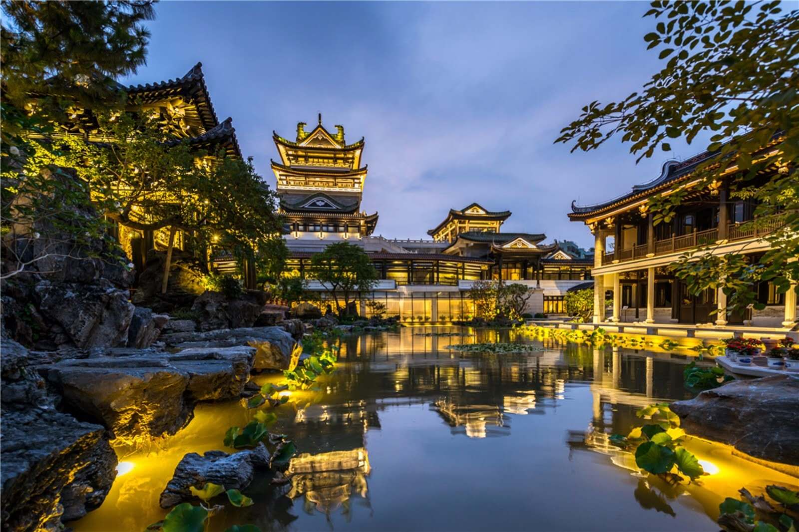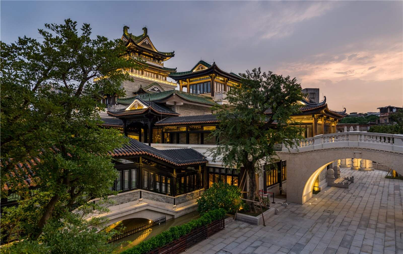 博物館總占地面積1.72萬平方米,建筑面積2.17萬平方米,沿荔枝灣涌三期分為南北兩岸,建筑形制為嶺南園林風格的仿古建筑群,內設基本陳列展廳、主題展廳、劇場、園林景區以及粵劇藝術傳承與保護等配套區域。園林景區由嶺南園林風格的仿古建筑群組成,總體布局沿十字軸骨架排布,環繞中心晚沙湖,錯落六組院落空間,院院相連又相對獨立,以傳統建筑工藝、技法的“三雕二塑一嵌” (木雕、磚雕、石雕、灰塑、陶塑、嵌瓷)為裝飾亮點。
