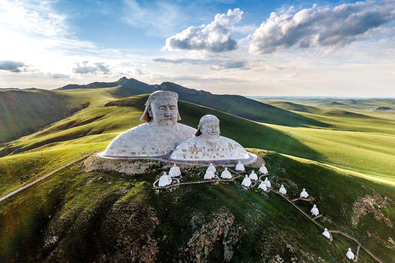 霍林郭勒市可汗山景區總投資5200萬元,占地面積13000余平方米,景區由山門、蒼狼之路、蒙元兵陣和蒙古帝王群四部分構成,其中成吉思汗頭像雕塑高達50米。