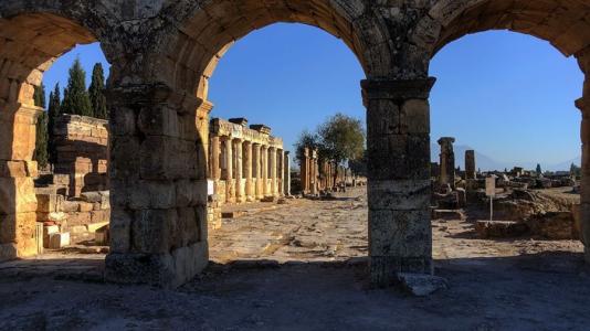 希拉波利斯遺址是一處引人入勝、發人深思的遺址。該遺址位于土耳其東南部的代尼茲利省,距離庫魯克蘇河谷北岸城鎮約22公里。遺址的海拔高度大約有500米,而與公園北部緊密相鄰接的科克雷茲山,竟然高達1,840米。頂點當然更高,但是在公園周邊地區,高山頂點的高度達到了2,308米 (巴巴達格山頂)和2,571米 (霍內茲山頂)。從羅馬時代起,雪白的石灰石連同熱泉一起就被認為具有神奇的巨大魔力。