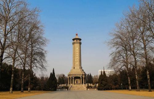 革命烈士紀念塔位于陵園中心位置,與南大門、紀念堂、北大門在同一中軸線上。1949年4月28日奠基,1950年5月1日落成,和北面的革命烈士紀念堂為陵園初建時的兩大主題建筑。塔高45米,塔的建筑形式為五角亭柱式(亦稱五角立體塔型),全部有花崗石、石灰石、鋼骨水泥構成,分為塔臺、塔身、塔頂三部分。塔頂綴以大型景泰藍質紅五星。塔身正面“革命烈士紀念塔”7個貼金大字為毛澤東主席親筆手書。