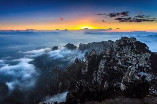 白石山位于太行山的最北端,最高峰佛光頂海拔2096米,登臨其頂可以遠眺狼牙山和五臺山。白石山景觀多樣,集峰林、怪石、絕壁、峽谷、瀑布、森林、云海、佛光、長城、廟觀等景觀于一體,地貌奇特,結構復雜,是中國古代“三十六洞天福地”之一。