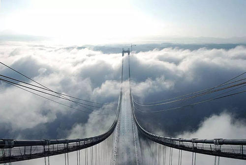 主橋為主跨1196米的雙塔單跨簡支鋼箱加勁梁懸索橋,大橋主纜分跨布置為320米+1196米+320米,橋面寬33.5米。