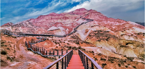 九色丹青觀景平臺九色丹青觀景平臺海拔1748米,平臺的造型宛若一把琵琶橫鋪在丹霞崖壁之間,遠遠望去,渾然天成。這里彩色的千巖萬壑仿佛觸手可及 ,色彩斑斕的丘陵仿似上帝的調(diào)色板,富含石青、石綠、朱砂、白堊、黃赭石等三十余種礦物質(zhì)的巖石在陽光的照射下,各種色彩濃烈地交織在一起,色調(diào)或如波浪順著山勢起伏,或從山頂傾瀉而下,山形肌理狀若潑墨山水,美不勝收。