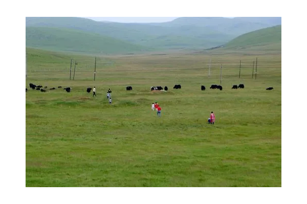 甘加草原周圍群山環繞,是一處典型的高原草地,理想的天然牧場。每到夏季,整個草原碧綠如茵,好似一塊天然的綠色大地毯,鮮花盛開,繁花似錦。藍天、白云、綠草渾然一體,央曲河和央拉河蜿轉流淌,猶如一條潔白的哈達飄落在草原上。