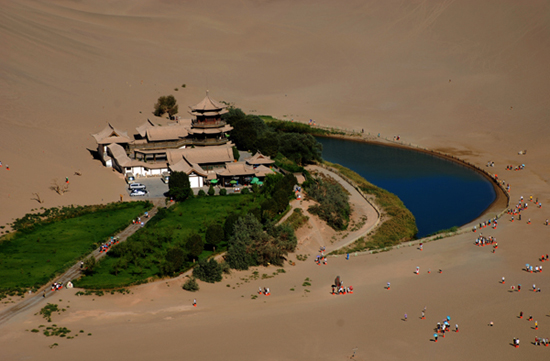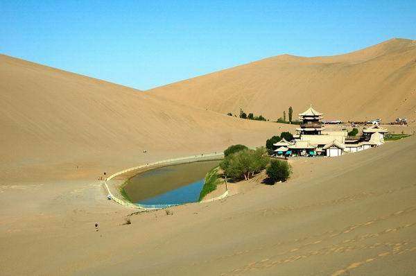 鳴沙山位距敦煌市南郊5公里,因沙動成響而得名。山為流沙積成,分紅、黃、綠、白、黑五色。漢稱沙角山,又名神沙山,魏晉時始稱鳴沙山。其山東西綿亙40余公里,南北寬約20余公里,沙壟相銜,盤桓回環。其特點:“峰巒陡峭,山脊如刃;馬踐人馳,殷殷有聲;輕若絲竹,重如雷鳴;沙隨足落,經宿復初。”