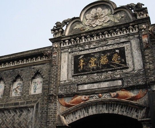 老公館大門整體足有兩層樓高,主體為灰磚墻,勾白縫。一對朱砂色石獅雄踞兩側,黑漆木門門楣上一對紅色鯉魚相向翹尾,兩個魚嘴似在爭搶中間的白珠。其上有四個描金大字——受富宜年,襯了黑底,兩側拉白瓷條飾。最上部為凸型拱邊,居中一朵粉紅色牡丹浮出墻面。整座大門裝飾繁復,色調沉穩大方。