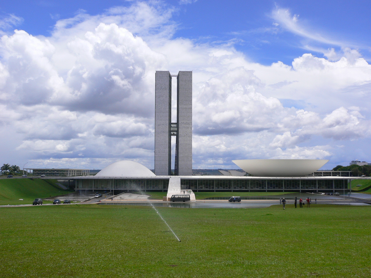 巴西利亞是一座只有30多年歷史的新城,沒有一處古代建筑。有名的現代建筑主要集中在城市的核心——三權廣場。國會大廈是兩座并列的28層長方形大樓,是全城最高的建筑。法律規定,任何建筑物都不得超過它的高度。兩座大樓之間由一條過廊連通,形成一個“H”形,這是葡萄牙文“人”的第一個字母,表示一切為了人。右側大樓為眾議院大廈,樓側是一個仰天的“大碗”,意為“廣聽民意”;左邊是參議院大廈,側旁亦有一個“大碗”,不過是倒扣,象征“集中民意形成決議”。