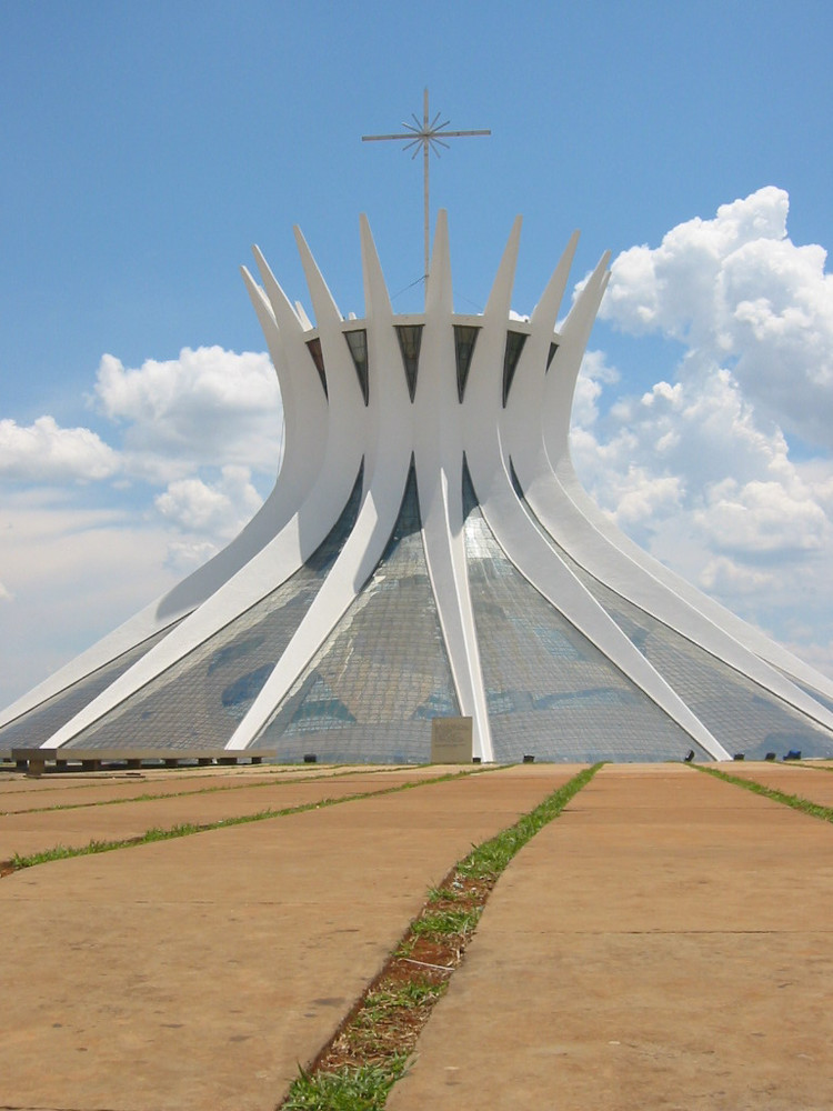 巴西利亞大教堂與傳統的歐洲教堂迥然不同。教堂主體坐落在地下,人們通過甬道進出。它沒有通常的高尖屋頂,16根拋物線狀的支柱支撐起教堂的穹頂,支柱間用大塊的彩色玻璃相接。