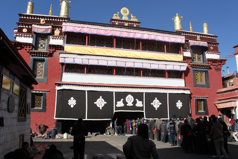 凈室門口兩側(cè)還供有四大天王泥塑像。最后部是佛殿,內(nèi)2柱,無柱礎(chǔ),面積23。5平方米。大柱表面用麻繩纏繞之后又用2~3厘米的泥皮涂抹,可能是防腐、防火的措施。柱頭雕有蓮花寶座,柱頭小栱上則無裝飾,具有明顯的早期特點(diǎn)。四壁的壁畫多為線描盤腿坐形象,筆法流暢生動(dòng)。大殿的墻壁均用大石塊夾小石片砌成,厚1~1。3米。殿內(nèi)供有尼泊爾墀尊公主帶來的銅鎏金不動(dòng)金剛佛和八大隨佛弟子泥塑像,以及兩大忿怒力士、宗喀巴塑像。佛殿后部和兩側(cè)還繞以密閉回廓,偏窄、較高,具有早期布局特征。神殿第二層前前為僧舍,中部為大經(jīng)堂天井,天井之后為供佛大殿,6柱,內(nèi)供桑杰魯王甲后、十六尊者及經(jīng)書;里面還有一大殿,8柱,內(nèi)供藥師八如來和《甘珠爾》佛典,北面供奉有救度母及其他佛像。神殿第三層前面為達(dá)賴?yán)锏皆撍碌膶S米》浚?間。后部則為金頂?shù)睿铋T向東,面積約54。5平方米,內(nèi)有明柱兩排8根,左右開小窗。殿左右及后部有一周狹窄回廓,以木欄相圍。金頂為漢式風(fēng)格,屬歇山式,以斗栱承托;金頂垂脊末端套有羯摩魚頭,是為套獸。殿內(nèi)門窗壁畫、柱子等則是藏式風(fēng)格,體現(xiàn)了藏漢建筑的巧妙結(jié)合。