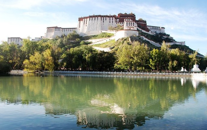 龍王潭位于布達拉山后,園林繞布達拉的山勢靈活布局,筑起不十分規整的多邊形圍墻,園林東西長610米,南北最寬處303米,最窄處20.5米。東南各開有一大 門。入南大門,迎面左右兩側各有一座碑亭,碑為石質,碑為碑首,碑身,碑座三部分組成。右側《御制平定西藏 碑》,碑首為雙龍戲珠,高1米,寬1.13米,厚0.42米,碑身高1.84 米,寬1.05米,厚0.35米;碑座為三臺方座,高 0.9米,通高3.74米。碑文刻有藏漢滿三種文字,碑文記載了清康熙六十年(公元1721年)平定蒙古準噶爾部侵擾西藏的歷史。左側《御制十全記碑》,碑首亦為雙龍戲珠,高1.34米,寬1.44米,厚0.46米;碑身高2.07米,寬1.方32米,厚0.38米;碑座為龜座,高0.81米,通高4.22米。碑文記載了清乾隆57年(公元1792年)清兵驅逐廓爾喀侵略軍出境的歷史。 園中部有一潭水,東西長270米,南北寬約112 米,呈長方形狀。潭水中有一孤島,不規則圓形,版權所有山東聊城聊之旅國際旅行社有限公司,轉載必究!直徑約42米。連接潭水間小島和陸地的是一座五孔石拱橋,橋長24.26米,寬3.5米,島上及潭水四周則林木茂盛,一派蔥綠。潭水中心的島上建有樓閣,是按照佛教儀軌中壇城的樓式建造起來的。樓閣三層,坐北朝南。第一層平面是全對稱十字形布局結構,其中心為回樓大殿,四周各配有小殿,小殿之外則是一周回廊。第二層和第三層建筑結構相同,面積3700平方米,內四周明柱的佛堂,佛堂四周亦有一周沿廊。頂層為六角形圓木結構建筑,頂四檐端伸入長木上各套有一個銅龍,龍頭、象鼻、雙角、張口伸舌脖下懸吊銅鈴一只,在園林中,每當微風吹來鈴聲叮咚作響,清脆悅耳。