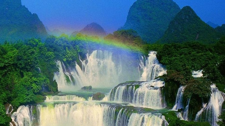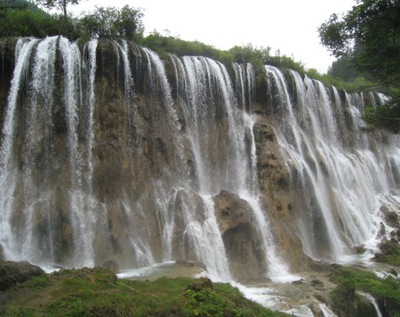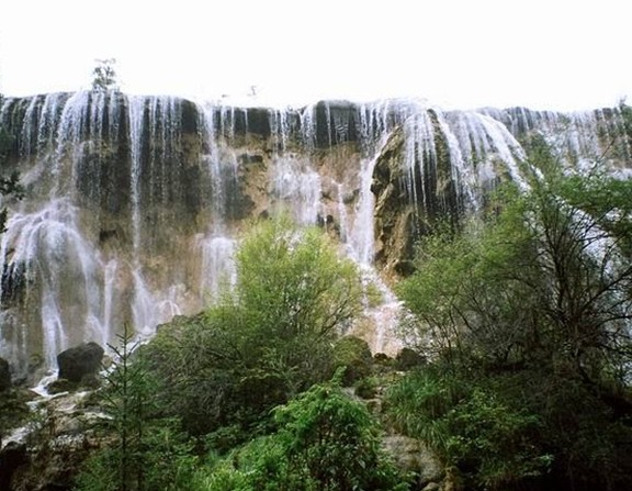 凌空而瀉的瀑布,象銀河倒懸,墜至半空,忽被峭石攔腰斬斷,剎時雪浪飛濺,宛如千萬串斷線的珍珠,紛紛揚揚,沿懸立千紉的絕壁陡然下墜,落進不見底的深淵,發出驚天動地的狂嘯。而河水卻象兇猛的野獸在咆哮,發出震耳欲聾的吼聲,仿佛整個峽谷在顫動。每到日落西山,“老虎嘴”彩虹繚繞,雪峰頂上緋紅一片,迷離變幻,奇勝不可名狀。