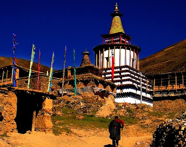 覺囊寺坐落在日喀則拉孜縣歐布瓊山山腰處,海拔4600米。始建于公元十二世紀,由貢巴•土杰尊珠主持修建。該寺曾有二萬多名僧人,在歐布瓊山上有二千多處修行洞和坐禪房,并修建了一座“萬佛一見得解塔”,塔高約27米,塔型呈“時輪壇城”,有108個門、108個殿堂。主供佛為喜繞堅贊師徒三尊佛。每年藏歷4月15日,該寺舉行“時轉跳神”活動。