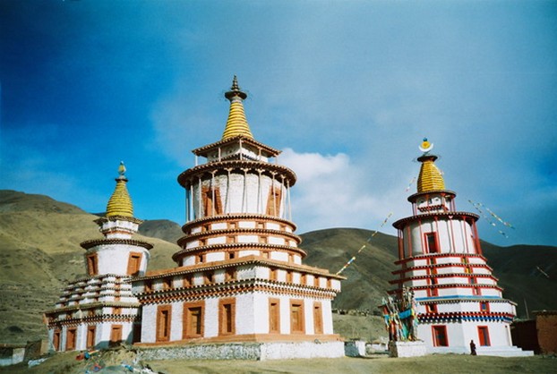 覺囊寺坐落在日喀則拉孜縣歐布瓊山山腰處,海拔4600米。始建于公元十二世紀,由貢巴?土杰尊珠主持修建。該寺曾有二萬多名僧人,在歐布瓊山上有二千多處修行洞和坐禪房,并修建了一座“萬佛一見得解塔”,塔高約27米,塔型呈“時輪壇城”,有108個門、108個殿堂。主供佛為喜繞堅贊師徒三尊佛。每年藏歷4月15日,該寺舉行“時轉跳神”活動。