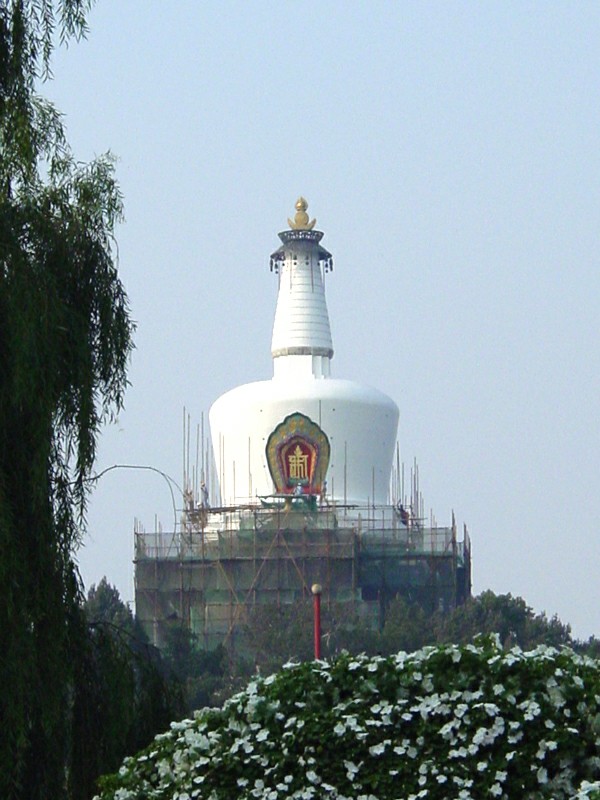 北海白塔—藏傳喇嘛塔 于清初順治八年(1651年),是一座藏式喇嘛塔。據建塔石碑記載,當時"有西域喇嘛者,欲以佛教陰贊皇猷,請立塔寺,壽國佑民",得到皇帝的恩準,于是修建了永安寺和白塔。塔高35.9米,上圓下方,富有變化,為須彌山座式,塔頂設有寶蓋、寶頂,并裝飾有日、月及火焰花紋,以表示"佛法"象日、月那樣光芒四射,永照大地。塔身正面有一盾形小龕,內塑紅底黃字的藏文圖案,含"吉祥如意"之意。此龕俗稱"眼光門",又叫"時輪金剛門"。1679年該塔被地震所毀,次年重建。1976年唐山地震波及北京,塔頂被損。在修復時,發現塔內主心木中藏有一個二寸見方的金漆盒子,盒蓋繪有太極圖,盒內藏有兩"舍利",證明此塔是一座舍利塔。該塔矗立于瓊島頂峰,綠蔭擁簇,巍峨壯美,引人矚目。這種象征神權的建筑物--白塔和永安寺,設置于瓊島的重要位置上,具有主宰全園的氣勢,以體現"君權神授"的封建思想,此是帝王宮苑的一大特色。