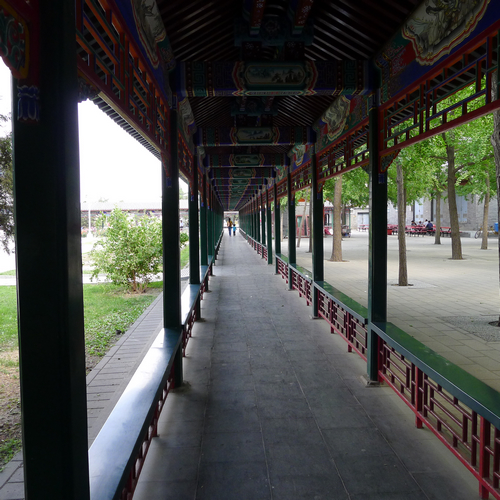 從南門(mén)入園,走過(guò)門(mén)廳,穿過(guò)曲折的彩繪長(zhǎng)廊,迎面矗立著一座藍(lán)琉璃瓦頂?shù)挠晒纛}寫(xiě)的“保衛(wèi)和平”漢白玉石坊(原稱(chēng)“克林德”坊和“公理戰(zhàn)勝”坊)。放眼北望,古柏成林,大多是明代所栽。其中有7株挺拔參天,要三、四人方能合抱。形態(tài)各異的古柏相傳為遼時(shí)種植,迄今已逾千年。還有一株槐樹(shù)與柏樹(shù)相抱而生。稱(chēng)“槐柏合抱”,至今仍枝繁葉茂,蔚為奇觀。由此西行就到了壇門(mén)外,一對(duì)雄俊的石獅系北宋遺物,是1918年從河北大名的一座古廟廢墟中發(fā)掘遷來(lái)守門(mén)的。