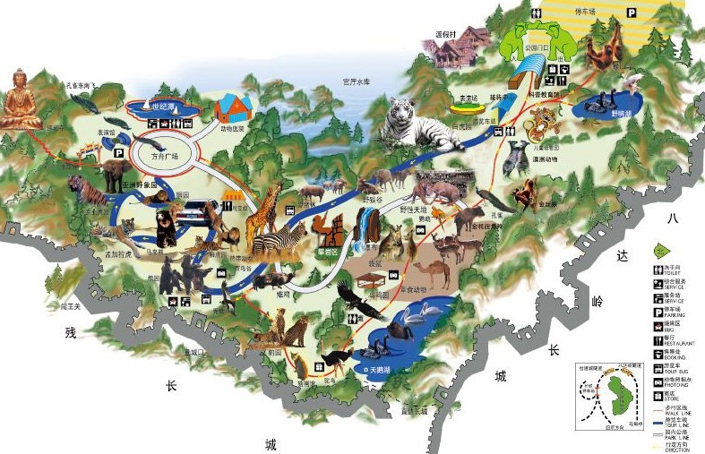 八達嶺野生動物世界設計建有30處景區及一個小型水庫,其中包括動物游覽區20處;古跡游覽區2處;表演場(館)4處;植物觀賞區1處;健身運動區2處。園內動物規模有47種達兩千余只(頭)。