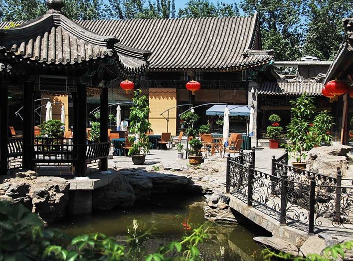 融合了江南庭院的湖光山色和古樸典雅的北方園林風光。景區有近4700平方米的湖面。湖畔倚建古色古香的水榭、畫舫、小園亭,湖南北架以曲橋、拱橋。