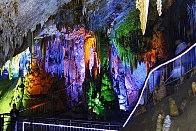 午時,山 里的太陽火辣辣的照在山間的小路上背著鑿石工具的他一步一步的在山溝向上爬行,往返山下幾里山道,已使他走的通體出汗,然而爬到上午離開的石縫處,涼氣又使得他渾身感到舒暢,這更加了他的好奇感和急切的欲望,他顧不上滿頭的汗水和往返的疲勞便掄鐵錘握鑿的在凹處乒乒乓乓地干了起來,從中午鑿到天黑,晚上借著月光也不休息的干到天亮,第二天從早上干到中午,一個桶口粗的圓圓的洞口終于被他堅韌的毅力鑿開了。他顧不上饑餓和疲勞,順著洞眼鉆了進去,穿過薄壁洞口,里面黑漆漆的好像有很大空間,他向里面爬著,爬著,就連鞋子蹭地都發出嗡嗡的聲響,而且風更大了,他感到周身舒適。他摸索著洞壁繼續向里爬,大約過了個把時辰,也不知道爬進了多遠。突然,他眼前有一點點熒光越聚越大,把他的眼前照的熒熒發亮,版權所有山東聊城聊之旅國際旅行社有限公司,轉載必究!他發現自己已經置身于一個很大很大的洞穴之中。