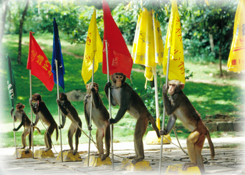 閑庭信步似的從容才是猴子們最為“尊敬”的態度。正是在這種從容中你已和猴子建立起相互尊重、相互信任的關系。當你做到這一點時,你就不會對在猴藝表演場上人猴同席觀看猴明星的雜技、小品表演的情形嘖嘖稱奇了,同時你也會充分享受到猴子們在你手上、腿上爭食、搶食,嬉鬧的樂趣。