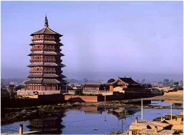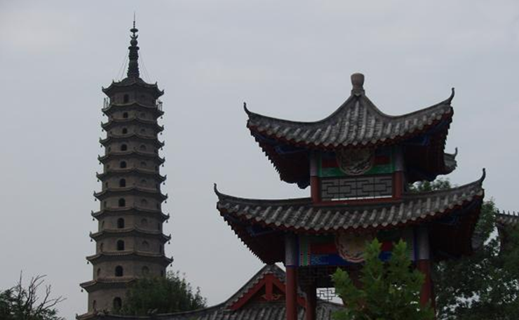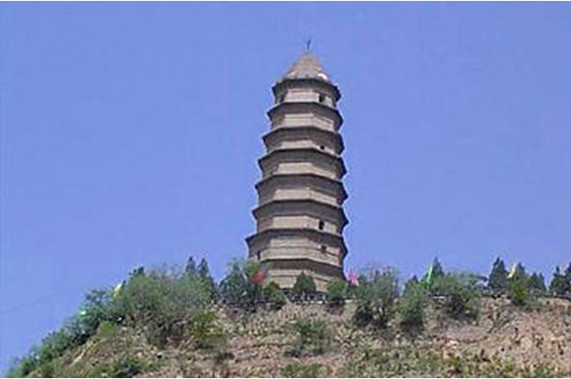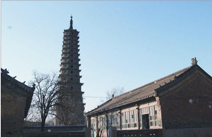 史稱唐塔,原名大覺寺塔,始建于唐貞觀十三年(公元639年),碑記為“尉遲敬德監(jiān)建”,距今已1300多年。原塔為八角密檐式磚石結(jié)構(gòu),青磚到頂,飛檐挑角,角系銅鈴,塔身13級,第一級南北各一門,其上每一級一南門,頂有相輪,全塔高約36米。明代維修時,吏部尚書楊巍撰有《重修大覺寺寶塔》,并刻石豎碑。