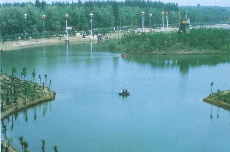 愉湖風光區,突出藍天、碧水、綠地的主題,以大片水面和大面積的森林景觀相映成趣。建有360畝的 沐浴庫區,筑有假山、湖心島,配有游船、皮滑艇、動力風車等游樂設施。栽植榆、五角楓、金絲柳等觀賞植物28種17萬株,栽植草皮5.1萬平方米。疏林密地,青少年活動區,水上風光區,別墅區,休療區等。與對餐交通干道臨南路融為一體,以大面積的水面和樹林塑造景觀。