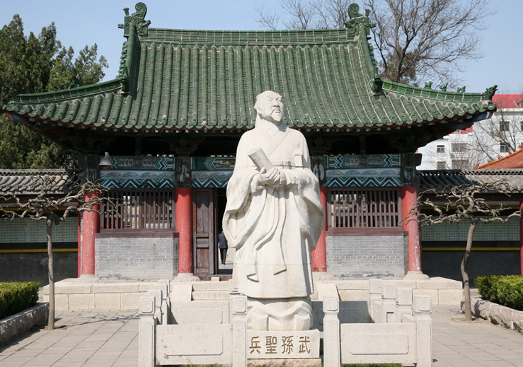 孫武祠位于廣饒縣城西北隅,占地面積8萬平方米,與廣饒關帝廟大殿毗連,由4個相互通連的仿宋式建筑組成。院內有一壁刻,書有確認孫武故里—齊國樂安就是現在廣饒的《史記》、《資治通鑒》等史書文獻的記載和若干考證。院正中是高3米,一手拿竹簡,一手持寶劍的孫武的石雕像,正殿內有孫武伏案疾書的銅像,版權所有山東聊城聊之旅國際旅行社有限公司,轉載必究!身后是展現《孫子兵法》精彩場景的大型壁畫。