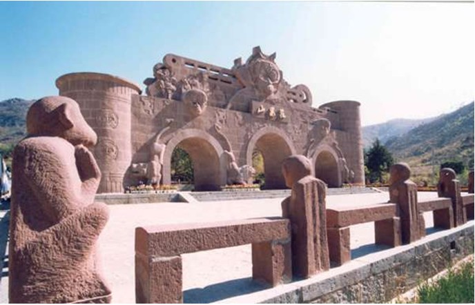 花果山山門建成于1996年7月1日。一到山門口,《西游記》氛圍便撲面而來。山門是在傳統(tǒng)古城門的骨架上,用現(xiàn)代表現(xiàn)手法加以渲染。正門上首為孫悟空的頭像,背襯圓形圖案,象征功德圓滿,法輪常轉(zhuǎn)。北側(cè)有唐僧師徒4人西方取經(jīng)的浮雕,下方有6只圓雕雄獅把門,廣場四周有109只石猴迎賓。山門背面的匾額上鐫“東勝神洲”四字,為中國書法家協(xié)會(huì)代主席沈鵬先生題寫。透過中間的門洞,可看到松林中吳承恩雕像。