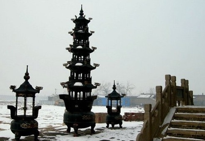 原四寺都有殿堂,據(jù)《盛京通志》卷九十七記載:永光寺原有大殿五楹,碑亭二座、天王殿三楹、鐘鼓樓二座、山門三楹。寺東寶塔一座,禪堂僧房二十四間。延壽寺原有大殿五楹、經(jīng)堂三楹、碑亭二座、天王殿三楹、鐘鼓樓二座、寺西寶塔一座、山門三楹、晾經(jīng)樓一楹、禪堂僧房三十間。廣慈寺原有大殿五楹、碑亭二座、天王殿三楹,鐘鼓樓二座、寺南塔一座、山門三楹……?,F(xiàn)在四寺的殿堂,除法輪寺保留大殿五楹,天王殿三楹,東西配殿各五楹,寺北寶塔一座,山門三楹外,其它各寺的建筑均已無存。四塔的建造形式,均為藏式喇嘛塔,是由基座、塔身、相輪三部分構(gòu)成?;鶠榉叫问殢涀?,有上下框,在四角和每面中間立有兩根石柱,從而每面構(gòu)成三個(gè)壸門。石柱上都雕有寶相花、西蕃蓮等紋飾。每面中間壸門置磚雕寶盆和火焰,左右壸門都有高大凸起的磚雕雄獅。基座上框之上又起三層磚砌圓壇座。上面即是寶瓶式塔身塔身的南面辟有佛龕內(nèi)供神牌,佛龕周圍嵌流麗的云珠。塔身之上為十三層相輪,再上為塔剎,版權(quán)所有山東聊城聊之旅國際旅行社有限公司,轉(zhuǎn)載必究!由銅鑄仰伏寶蓋、日、月、寶珠組成。寶蓋之下懸風(fēng)鐸。西塔因年久失修,已殘破不堪,于1968年拆除。西塔塔身內(nèi)出有五谷、松柏樹枝、香泥小塔、金銀塊和金珠、琥珀珠、瑪瑙珠、寶石珠等,還有多種文字的經(jīng)卷。在地宮中出土了銅質(zhì)鎏金天地佛(系密宗大威德金剛),天佛是一頭四面,頭戴王冠,頭上還有一立佛,十二只手臂,手中握有降魔杵,捆仙索,照妖鏡等法器。地佛與天佛相擁,手中也握有法器。天地佛身下懸有許多人頭,腳下踩著一仰一伏的兩個(gè)魔身。地宮中還出有塔式小銀盒,盒內(nèi)裝一小葫蘆,玉匜。在一景泰蘭盤內(nèi)裝有琥珀珠、碧璽珠、藍(lán)色料珠、綠松石,紅寶石、藍(lán)寶石,孔雀石,是為七寶,還有果品等。當(dāng)為天地佛供養(yǎng)之物。