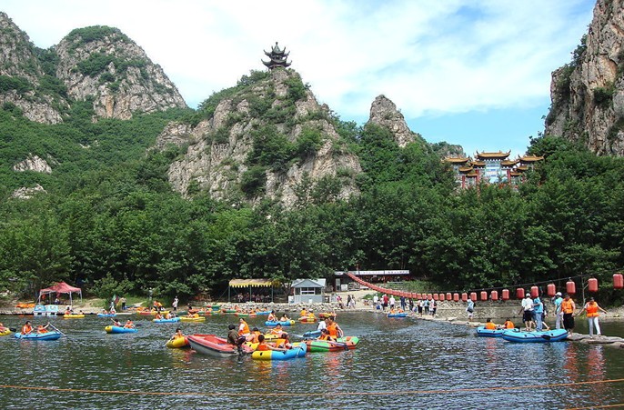 是由英納河緩聚而成的湖,由于冰峪的東南面近海,海水形成的霧氣經常大團的涌進谷口,使這里云霧籠罩,而英納河從西北流來,在這里形成了一個美麗的大湖,云水渡是取云水共渡之意。云水渡是冰峪溝風景區的精華所在,兩岸峭壁秀絕,奇峰怪石林立。其中有一根石柱,高40米,稱之為“中流砥柱”,它周圍的水域叫“龍門潭“,因潭中鯉魚很多,取“鯉魚跳龍門”之意。