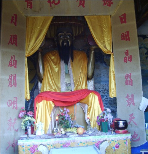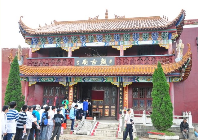 地處河北省滄州市北的青縣城南6公里有村曰“大盤古”,村西有座盤古廟。盤古廟始建于元世祖至元十五年(1278年),明弘治和崇禎年間曾重修,清康熙二十七年(1688年)因河流沖刷,設于秋祠西南重建,均有碑記。據文獻記載和民間傳說,當年的盤古廟狀似北京的故宮三殿,石、磚、木結構,琉璃瓦蓋頂,金碧輝煌,蔚為壯觀。前殿高三丈六尺,象征一年360天;臺階18級,為18層地獄之說;飛檐椽子108根,按36天罡、72地煞而布;每根椽頭系銅鈴一枚,照工、商、角、征、羽五音而置,有所謂“風搖鈴響天動樂,光照殿頂地生輝”之說。殿內有身披樹葉,手托日月的鐵鑄涂金盤古像,高一丈零八寸。中殿塑有南海觀音像,股坐蓮盆,金童玉女立兩側。版權所有山東聊城聊之旅國際旅行社有限公司,轉載必究!后殿設老君、孔子、龍王三塑像,殿前有合抱粗的合歡樹兩株,殿后鐵磬懸于古槐??上ПP古廟在1947年毀于戰火。九十年代,當地群眾組織起來修復盤古勝跡,以滿足來此朝圣拜祖的人流尋訪。