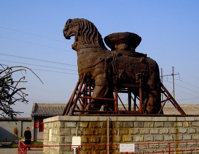 河北滄州鐵獅子鑄于后周廣順三年(公元953年),距今已有一千多年的歷史,采用“泥范明澆法”鑄成,具有較高的歷史科學(xué)和藝術(shù)價(jià)值,為全國(guó)重點(diǎn)文物保護(hù)單位。通寬5.35米,身長(zhǎng)6.30米,身高6.6米,體寬3.0米,重約40噸,素有“獅子王”的美譽(yù),一千多年來,它飽經(jīng)滄桑,在古滄州,它曾被當(dāng)成神物供奉,享盡了香火;在烽火連天、哀鴻遍野的戰(zhàn)亂年代,又經(jīng)受了刀戈的砍殺,在獅體內(nèi)外斑痕累累。