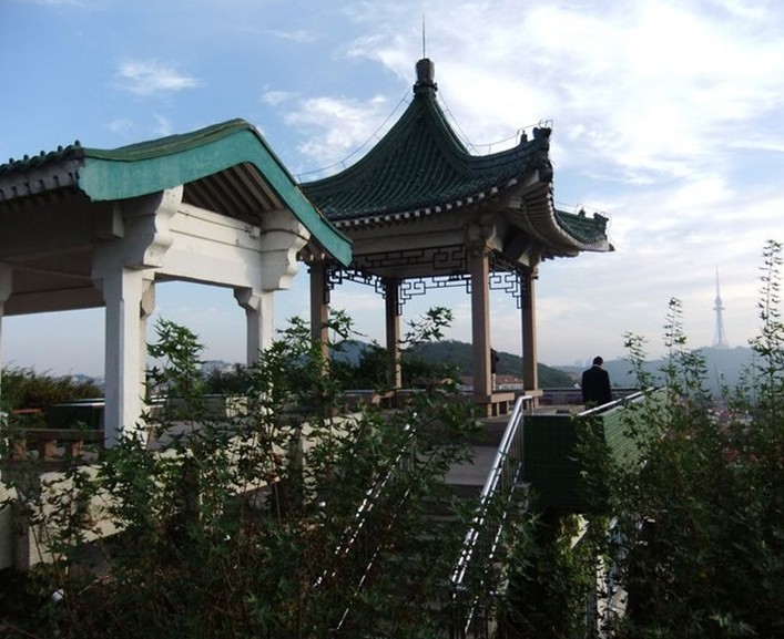 我們從小魚山的大門抬階而上,看到的這個亭子是一個挑檐式的六角亭,在亭內可以把碧波蕩漾的匯泉灣一覽無余,故得名“碧波亭”。“碧波亭”的匾額“碧波”二字是由著名的國畫藝術大師吳作人手書的。大家看遠處的山上有三棟紅色蘑菇樓宛如三柄熊熊燃燒的火炬,那是青島市十大山頭公園之一的信號山公園。在半山腰綠樹叢中的那棟別具特色的建筑是青島市迎賓館,原是“德國總督府官邸”。我們再由“碧波亭”拾階而上,站護欄邊可以看到右下邊有兩幢民族式建筑,一座形如城樓,一座貌似宮殿,那就是青島市海產博物館。